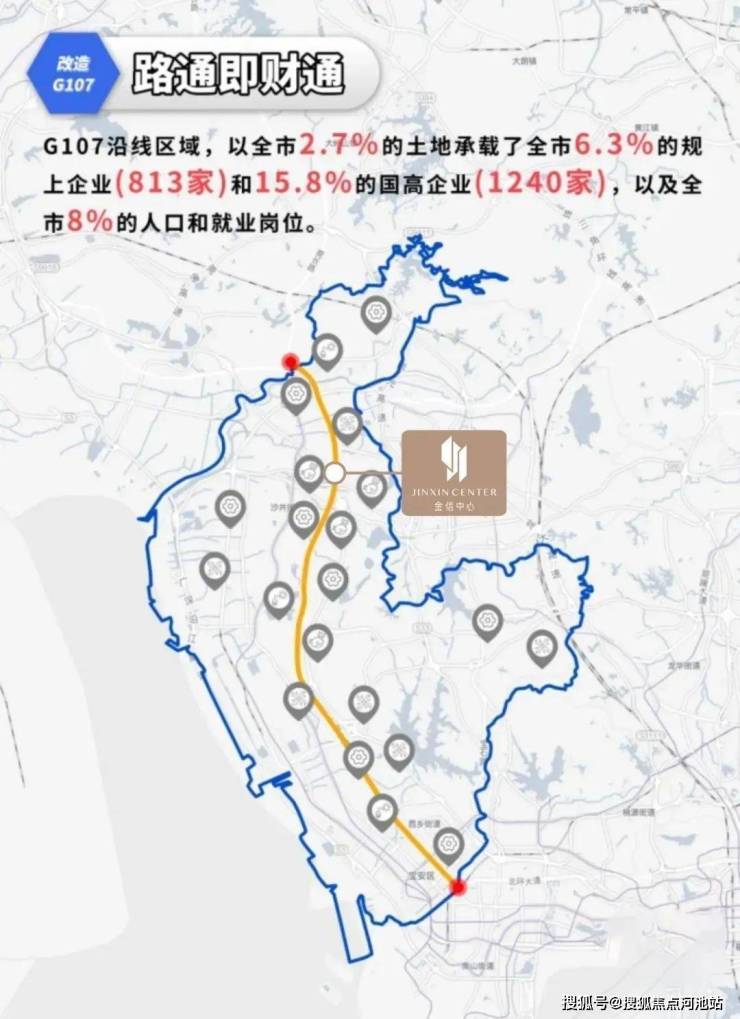 107国道沿线高端制造业密集、土地整备潜力大。有数据显示,107国道沿线占据全市2.7%的土地,承载了全市6.3%的规上企业(813家)和15.8%的国高企业(1240家),以及全市8%的人口和就业岗位(150万人口、90万岗位)。