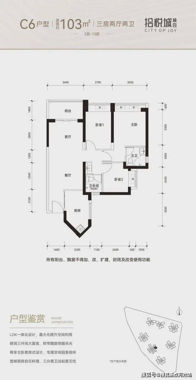 100平三房:设计的是竖厅格局,进门入户玄关,客厅3.4米开间,LDKB一体化设计,3个卧室分别做到了3米/2.9米/2.5米的宽度,U型厨房,公卫三段式分离,得房率:77.14%(不含赠送),阳台1.8米宽度,西南或东南朝向。