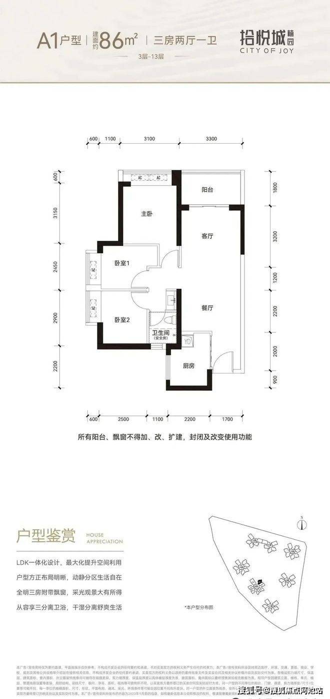 86平三房:设计的是竖厅格局,进门入户玄关,客厅3.3米开间,LDKB一体化设计,3个卧室分别做到了3.1米/2.9米/2.45米的宽度,U型厨房,卫生间三段式分离,得房率:76.92%(不含赠送),阳台1.8米宽度,东北朝向。