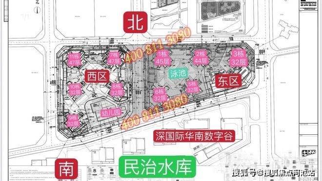 西区:占地2.2万㎡,容积率5.16,包含住宅、商业、幼儿园学校和其它基础配套设施。7栋、12栋总高47F,3T6户;8栋总高32F,2T5户;10栋、11栋总高32F,2T6户;9栋是幼儿园。