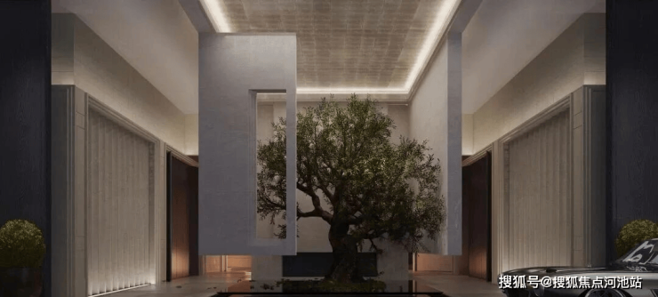 约13m挑空的下沉庭院,以约4.5m高玻璃幕墙引景入地,形成“主入口-艺术环廊-视觉水景”的空间序列。地下一层光庭为车库引入自然光线,实现功能与美学的统一。
