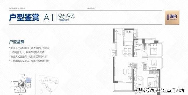 96-97㎡3房2厅2卫02(A1)户型,设计的是竖厅两个半开间朝东南,客厅开间3.5米,LDKB一体化,S墙设计预留冰箱卡槽位,动静分区,次卧东北向。