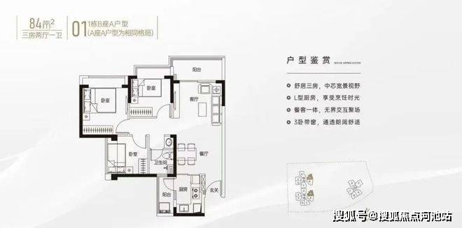 84㎡的3房2厅1卫,A户型,设计的是经典竖厅格局,客厅3.4米开间,LDKB一体化设计,动静分区,L型厨房还带1个生活阳台,卫生间三段式干湿分离,得房率约79%(不含赠送),东北朝向。