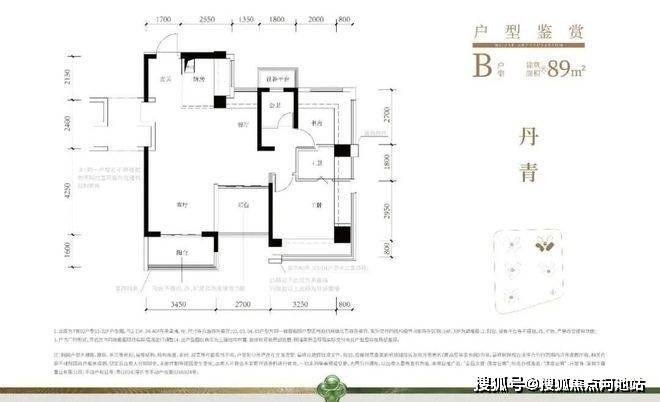 89㎡的4房2厅2卫,设计的是经典竖厅格局,进门入户玄关,客厅3.45米开间,动静分区,三开间朝南,分别做到了主卧14.54㎡/次卧7.96㎡/次卧7.56㎡/次卧5.8m²(包含墙体飘窗),主卧+1个次卧270°飘窗,U型厨房,公卫三段式干湿分离,得房率约102.2%(包含赠送),阳台5.52m²西南或东南朝向。飘窗赠送面积13.17m²+阳台赠送面积6.61m²+设备平台1.8m²=实际赠送面积约21.58m²。