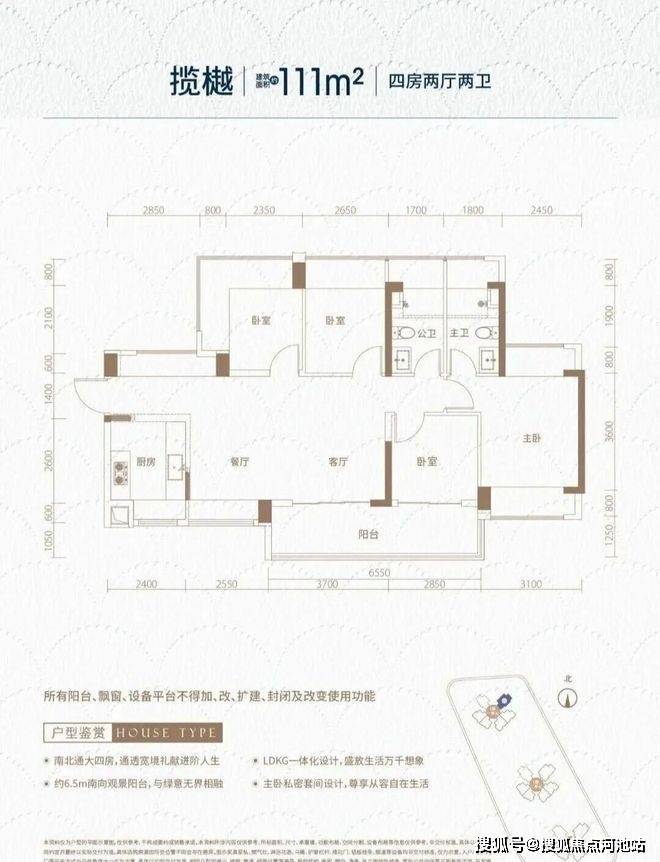 111㎡的4房2厅2卫,设计的是横厅南北通透格局,独门独户,进门入户玄关,客餐厅6.25米开间,LDKB一体化,全屋10面飘窗,主卧南北通,分别做到了主卧16.6㎡/次卧10.54㎡/次卧9.27㎡/次卧7.41㎡(包含墙体飘窗),U型厨房,卫生间干湿分离,得房率约102%(包含赠送),客厅连接次卧出6.55米长的大阳台,约10.8㎡主朝东南向。