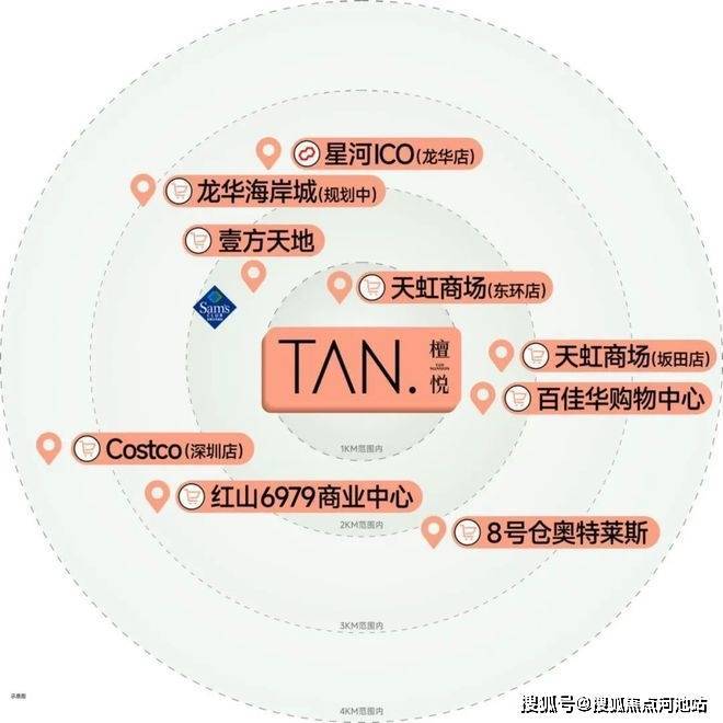项目自带特色商业街,并且紧邻项目有天虹商场(东环店),距离壹方天地(建面约60万㎡航母级体验式商业集群)约1.5km,周边还有山姆会员店、天虹商场(坂田店)以及Costco会员旗舰店等,一站式满足不同生活需求。