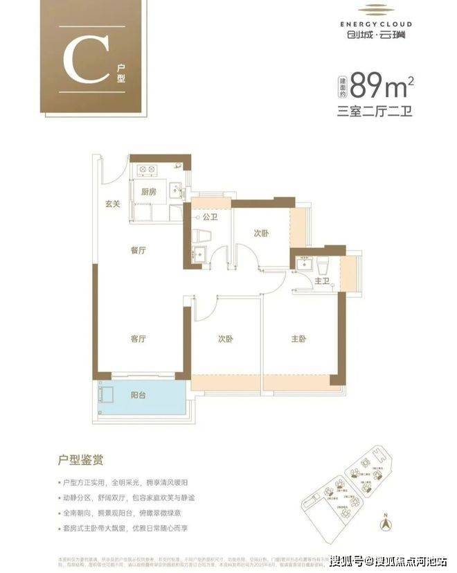 -89㎡3房2厅2卫:设计的是经典竖厅格局,LDKB一体化设计,客厅3.5米开间,三开间朝南,U型厨房,卫生间干湿分离,阳台有正东、西北、东北、东南、西南朝向。