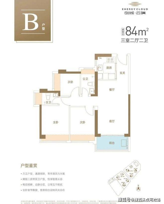 -84㎡3房2厅2卫:设计的是竖厅格局,LDKB一体化设计,客厅3.4米开间,U型厨房,卫生间干湿分离,阳台有正东、西北、东北、东南、西南朝向。