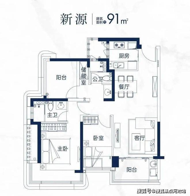 91㎡的3房2厅2卫,设计的是经典竖厅格局,进门入户玄关,客厅3.3米开间,LDKB一体化设计,动静分区,三开间朝南,主卧转角飘窗带1个设备平台,U型厨房,公卫三段式干湿分离,还带1个设备平台,得房率约89%(包含赠送),正南朝向。