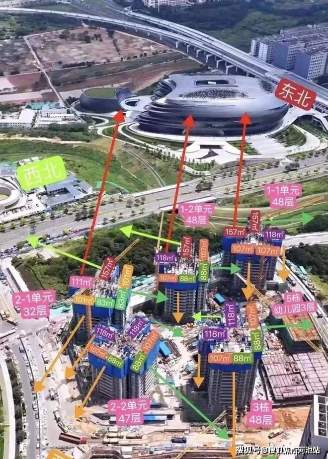 本次推售的是满京华金硕悦府,共由5栋32-48层高的住宅组成,其中1栋1/2单元住宅48F,2栋1单元住宅32F,2栋2单元住宅47F,3栋住宅48F,4栋是1所幼儿园,还配建有社区菜市场,总规划1186户,其中2栋1单元2梯6户,1栋1单元楼王3梯5户,其它栋数全部3梯6户设计。