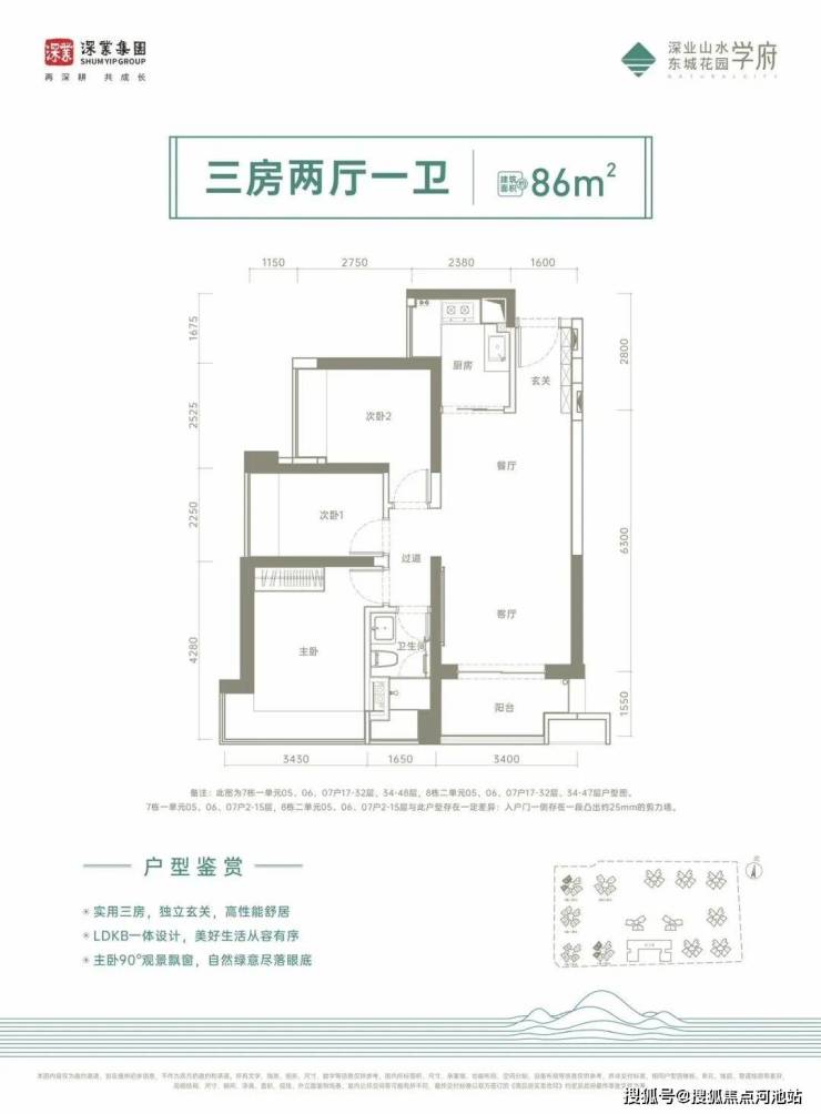 86㎡的3房2厅1卫,设计的是竖厅格局,进门入户玄关,客厅3.4米开间,LDKB一体化设计,3个卧室分别做到了3.43米/2.52米/2.25米的宽度,L型厨房,卫生间干湿分离,得房率:75%(不含赠送),西南、东南或西北向。