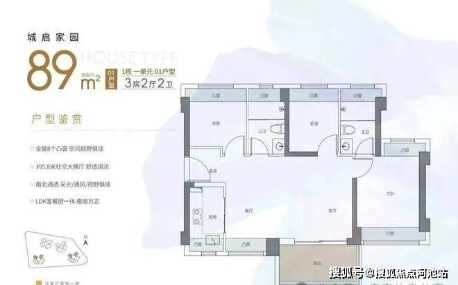 89㎡的3房2厅2卫,02.03户型,设计的是经典竖厅格局,客厅3.4米开间,LDKB一体化,S墙设计预留冰箱卡槽位,动静分区,三开间朝南,3个卧室分别做到了主卧13.79㎡/次卧7.62㎡/次卧6.93㎡(包含墙体飘窗),主卧+1个次卧270°飘窗设计,U型厨房,公卫三段式分离,客厅连接卧室出5.75米长的大阳台,得房率约87.2%(包含赠送),东南朝向。