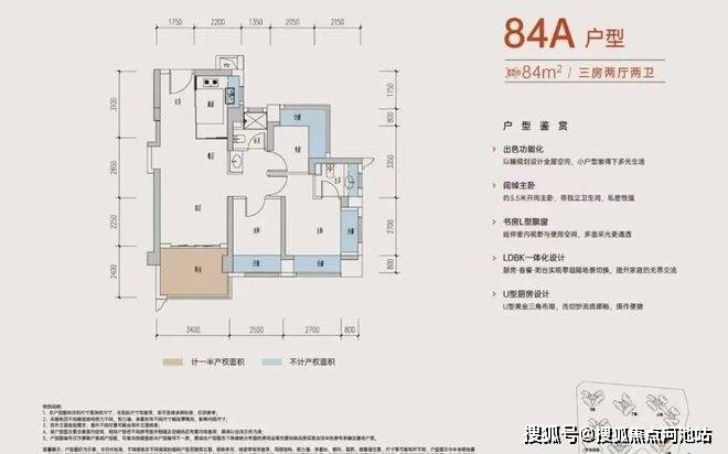 84㎡的3房2厅2卫,设计的是经典竖厅格局,进门入户玄关,客厅3.4米开间,LDKB一体化,S墙设计预留冰箱位,动静分区,分别做到了主卧13.5㎡/次卧8.75㎡/次卧8.6㎡(包含墙体飘窗),U型厨房,公卫三段式干湿分离,得房率约:77.2%(不含赠送),东北朝向。