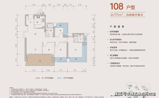 108-110㎡的4房2厅2卫,A户型,设计的是经典竖厅格局,进门入户玄关,客厅3.45米开间,LDKB一体化,S墙设计预留冰箱卡槽位,四开间朝南,动静分区,主卧+1个次卧270度大飘窗,客厅连接次卧出6米长大阳台,分别做到了主卧16.4㎡/次卧11.2㎡/次卧7.84㎡/次卧6.25㎡(包含墙体飘窗),U型厨房,卫生间干湿分离,得房率约:77.3-77.39%(不含赠送),西南朝向。赠送面积18.4㎡,加上赠送得房率94.04%。