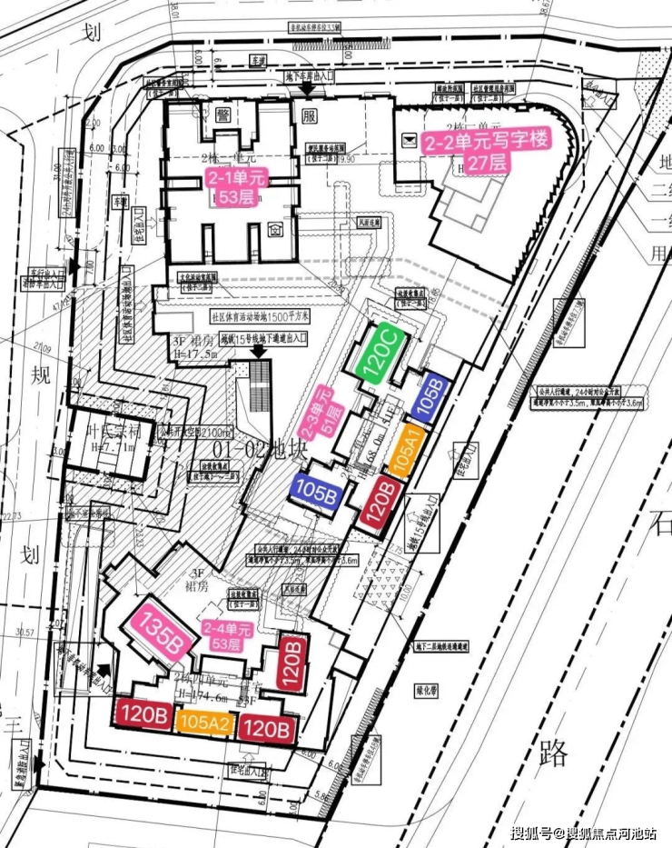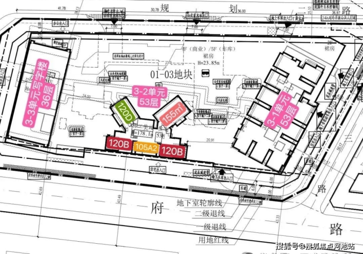 03地块分为三个单元,3栋一单元住宅为55层,3栋二单元住宅为55层,3栋三单元写字楼为36层,项目容积率为11.44,总建筑面积为176659.20平方米规划住宅建面约7.65万㎡,商业建面约1.5万㎡,办公面积约0.6万㎡,酒店约1.9万㎡。项目规划1120套(回迁981套+可售139套),停车数1019个。