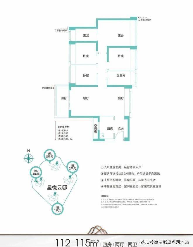 112㎡的4房2厅2卫,设计的竖厅通透格局,客厅3.7米开间,进门独立入户玄关,全屋飘窗设计,得房率:78.16%(不含赠送),阳台主朝西北或东北向。