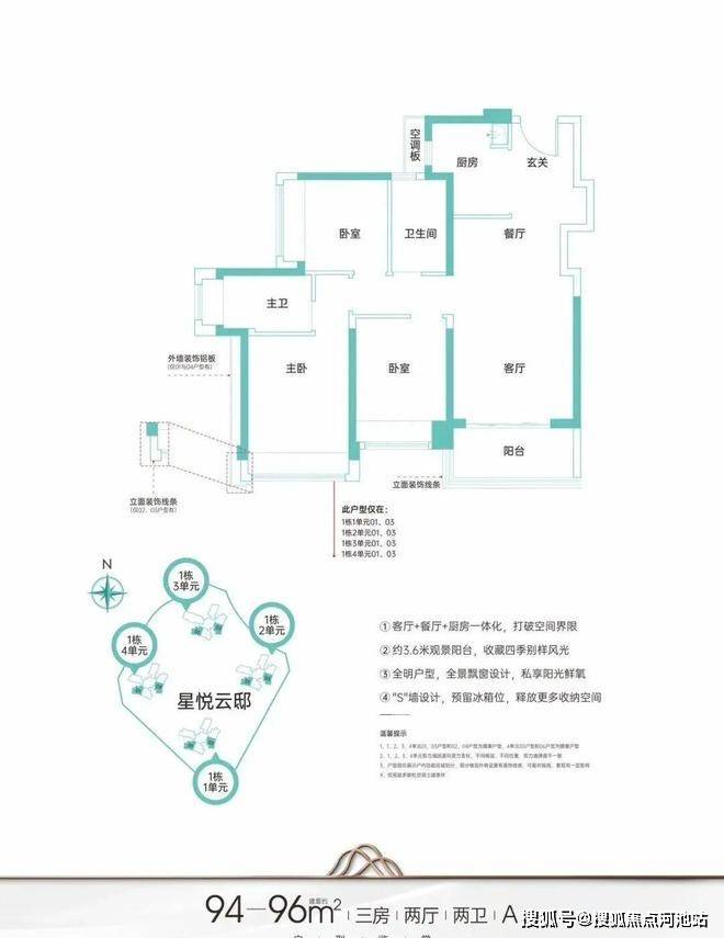 94㎡的3房2厅2卫,设计的经典竖厅格局,客厅3.6米开间,客餐厨一体化,S墙设计预留冰箱位,三开间朝南,U型厨房,得房率:78.15%(不含赠送),有西南及东南朝向。