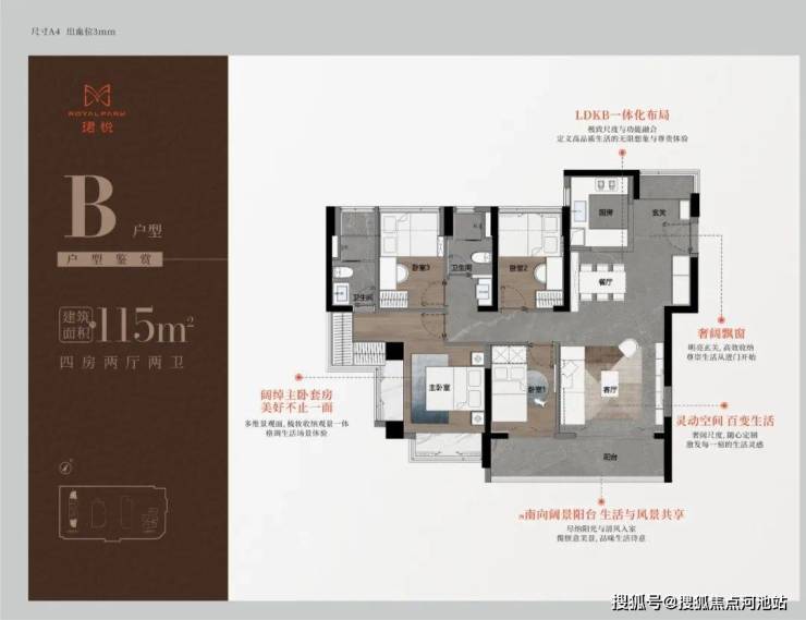 115㎡的4房2厅2卫,A户型(1栋1单元05户型),设计的是经典竖厅格局,进门入户玄关,LDKB一体化,S墙设计预留冰箱卡槽位,四开间朝南,动静分区,主卧双面飘窗,客厅连接次卧出6.2米长的巨幕大阳台,U型厨房,公卫三段式分离,东南朝向,靓点是2个最小的次卧都不用睡飘窗。
