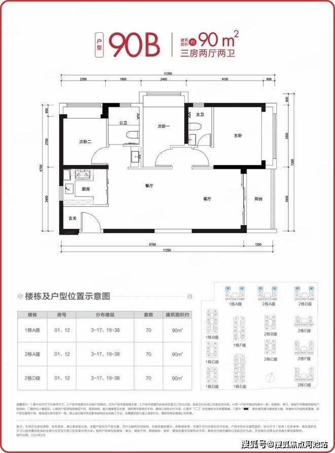 约70㎡两房和约90㎡三房都细分了三种户型,除约70㎡A户型为竖厅双龙抱珠结构外,其它五种户型均为竖厅动静分区结构。