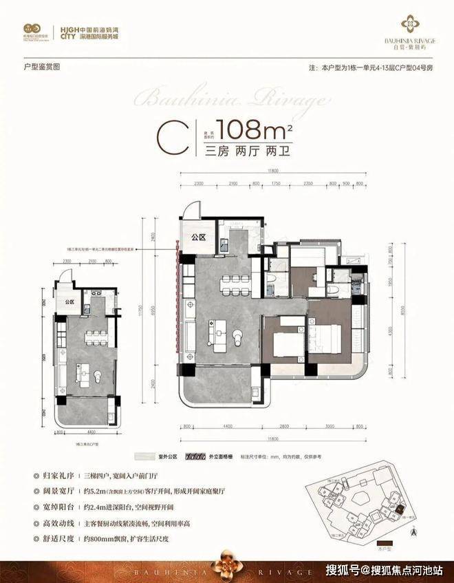 108㎡精奢三房:折后仅887.5万起(一线精装,270°景观)阳台宽2.4米、客厅开间约5.2米