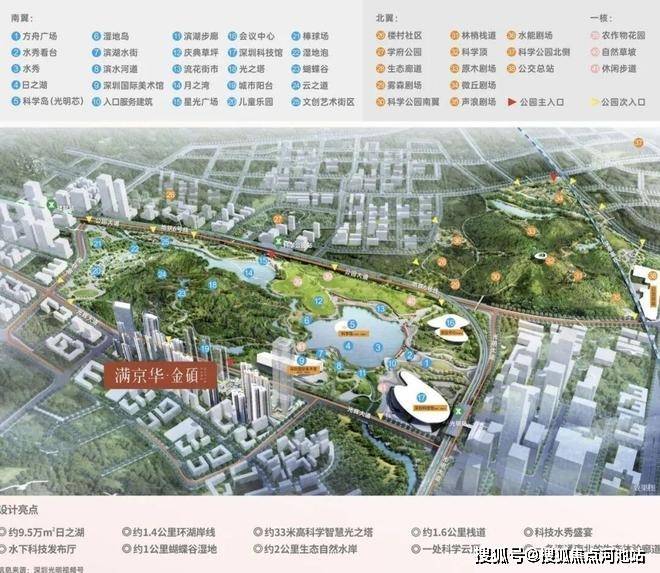 光明满京华项目最大亮点是三园环抱的生态格局——无遮挡俯瞰科学公园绿意,毗邻狮山公园与楼村水系,将自然绿肺融入日常居住。社区内享奢雅园林,外部近享深圳科学技术馆、深圳国际美术馆等市政配套,真正做到"出则繁华、入则静谧"。