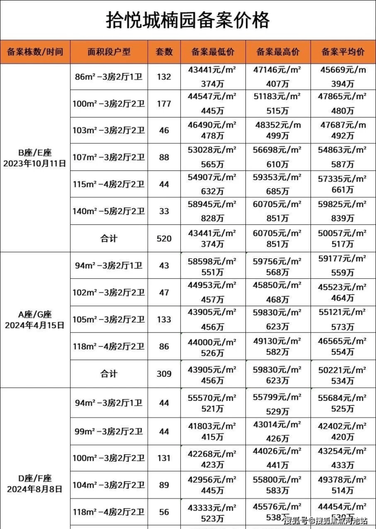 拾悦城二期楠园:2023年10月11号推出来B座、E座一共520套,面积86㎡~141㎡,备案均价50057元,备案总价374万~851万,折扣91折。这个价格开盘的时候卖的很差。后面直接85折+60万免息贷款,成交一下就上来了。
