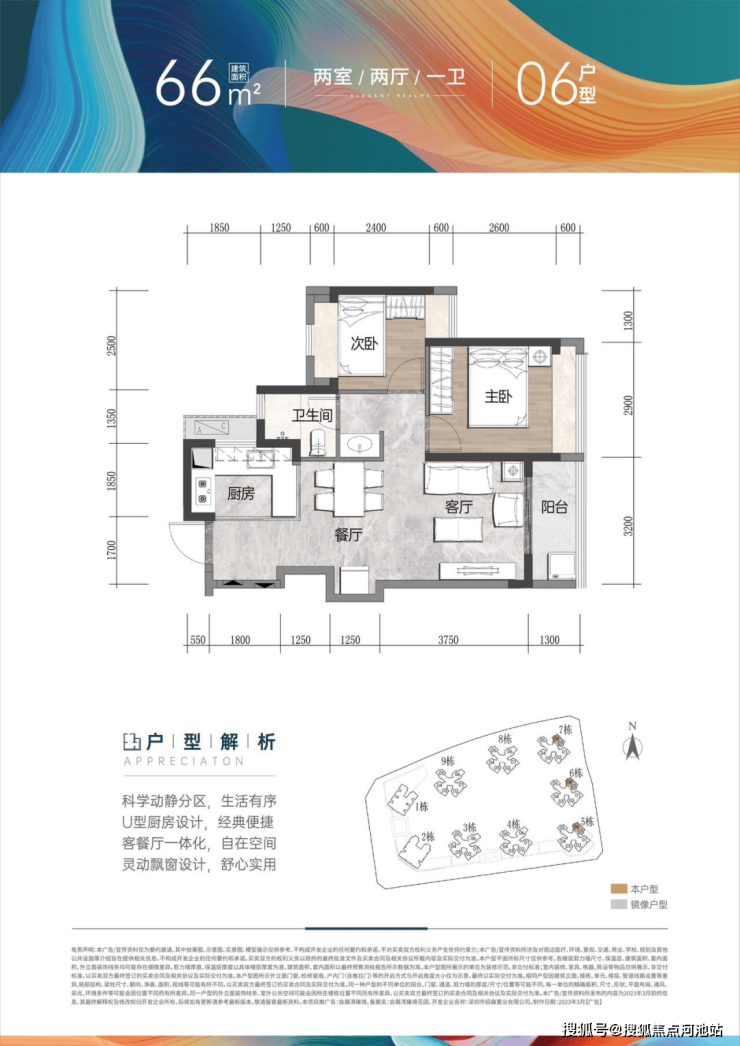 • 建面约66㎡ 2房2厅1卫:南北通透,全凸窗设计,开放式U型厨房