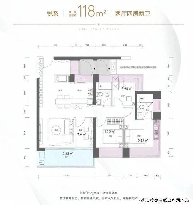118㎡的4房2厅2卫,1栋2单元02户型,设计的是竖厅格局,进门约6.12平的入户玄关位,客厅3.5米开间,LDKB一体化设计,四开间朝南,动静分区,分别做到了主卧15.67㎡/次卧11.35㎡/次卧8.46㎡/次卧7.4㎡(包含墙体飘窗),客厅连接次卧出5.75米长的大阳台约10.35平,U型厨房,公卫三段式干湿分离,得房率约96.5%(包含赠送),东南朝向。这个户型区别之处在于公卫,卧室,飘窗赠送面积14.31㎡+阳台赠送面积5.17㎡=实际赠送19.48㎡。