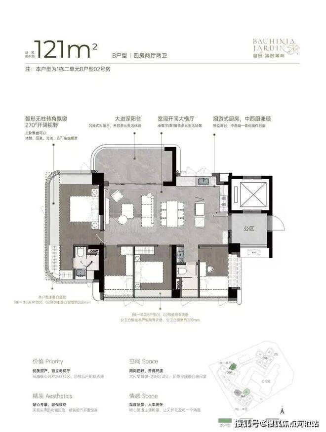 双龙抱珠户型,书房分布于客厅另一侧,且难得是双面采光+270°景观视野。主卧南北通透,且拥有十分开阔的景观面。贯通式阳台联通客厅以及靠近动区的次卧,实现长观景阳台