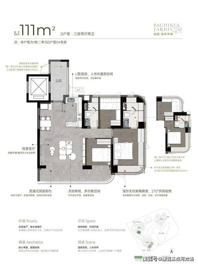 从空间布局来看,U 型厨房的设计极为人性化,大开间客厅与宽阳台是整个户型的最大亮点,西南向视野使得整个户型采光充足,贯通式阔景阳台与客厅、卧室双通,极大地拓展了生活空间的宽度。主卧的飘窗台也是一大亮点,弧形无柱转角飘窗不仅提供了广阔的视野,还增加了室内的采光。