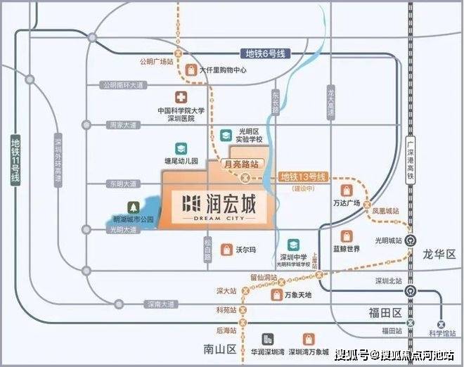 片区更新单元有轨道快线13号线(在建)穿过,是13号线(在建)月亮路站的TOD大城。从月亮路站出发,1站即达凤凰城站,在此处换乘6号线,可便捷通达福田中心;3站即到轨道枢纽光明城站,搭乘高铁,可快速直达深圳北、福田。