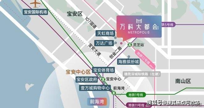 万科大都会项目位于深圳市宝安区大悦城旁、灵芝地铁口西侧约300米,步行即达地铁站,2站直达宝中,5站前海湾,出行高效便捷。周边百万体量商业环伺、六大公园环绕、名校资源云集,再加上万科打造的高奢社区品质,真正实现“入则静谧,出则繁华”的理想生活。