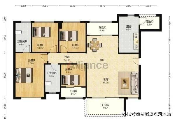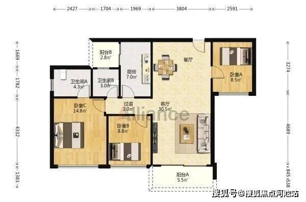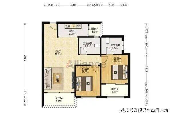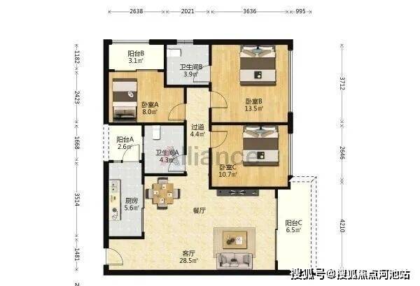 B/C座 A户型:约119㎡3房2厅2卫