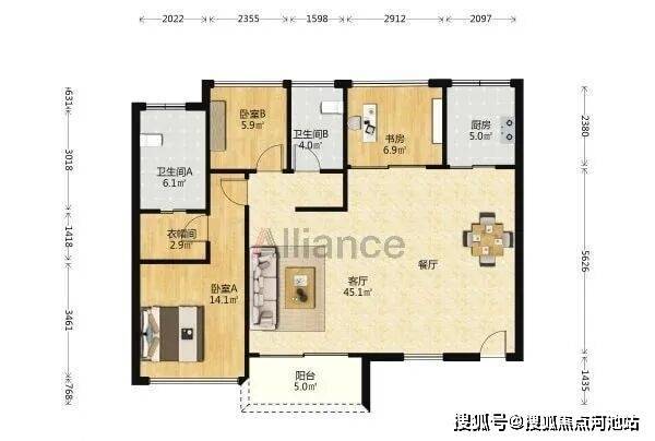 该户型朝西南和东南,南北透通,带两个阳台,餐厅和入户都可拓展,书房可改4房,不足之处在于玄关、过道处有点浪费面积。