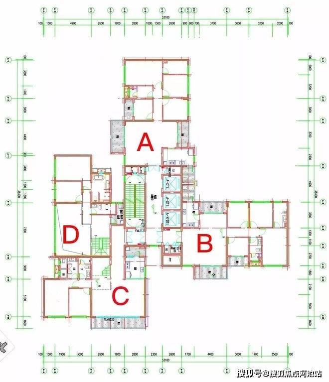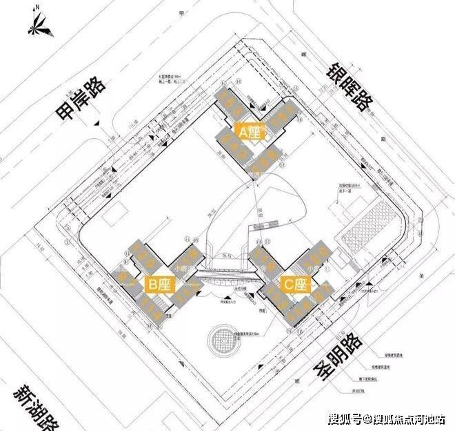 项目三栋住宅均为塔楼设计,A座三梯四户,B座、C座均为三梯五户,各栋户型分布平面图如下:
