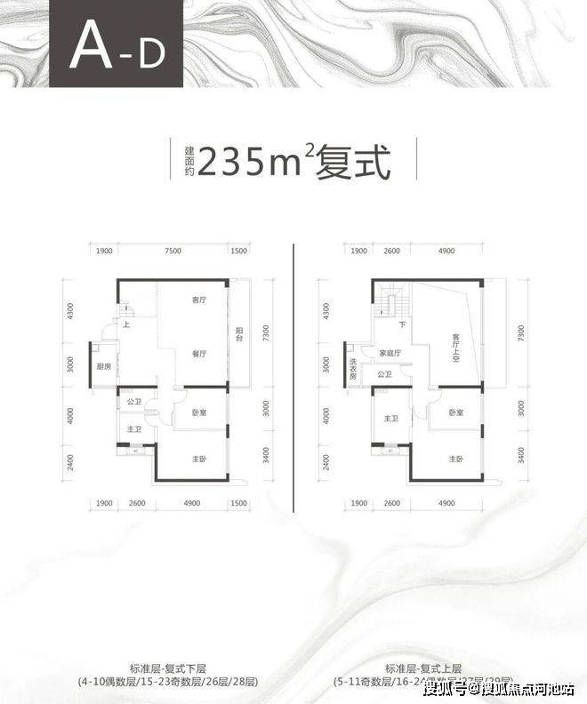 以上两种复式户型格局大体相似,具体面积有些许不同,为东南和西南朝向,4个卫生间配置也算比较奢侈的了。客厅开间达7.3米,出进深1.6米的阳台,视野开拓感还是比较好的。
