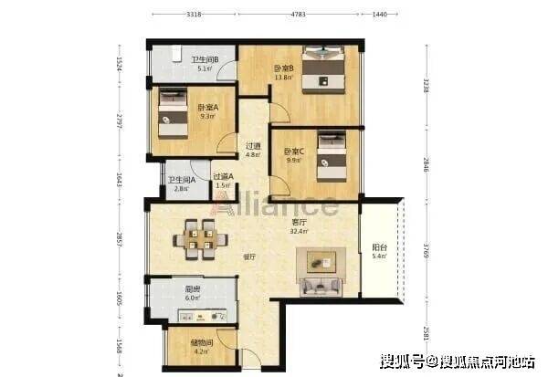B/C座 B户型:约118㎡3房2厅1卫