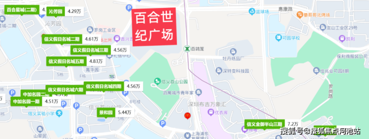 百合世纪广场,位于龙岗区布吉街道惠康路与翔鸽路交汇处,家门口是5号地铁线“百鸽笼站”,北侧是万科红,南侧毗邻百外世纪小学,荔山公园,周边多为小区住宅,居住氛围浓厚,布吉万象汇距离约300米。
