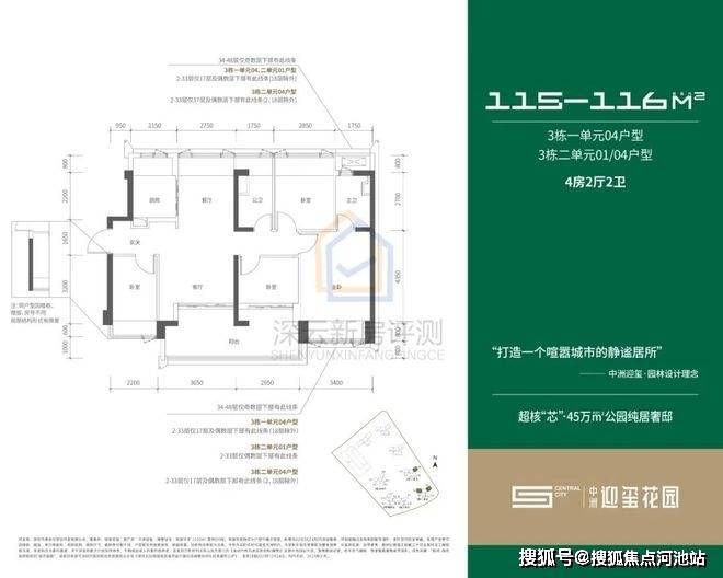 2单元:01、04户型115㎡;02、03户型96㎡;