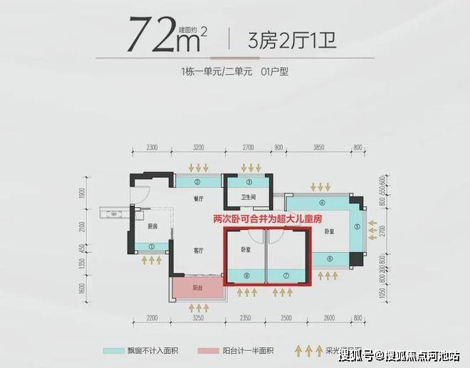 户型灵动百变。客厅与一侧的次卧可以合并,加大客厅空间,根据需求做两房;主/次卧带L型大尺度飘窗,双面采光,清风流淌。