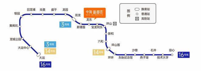 地铁配套:中海新都荟,家门口就是16号地铁线“龙东站”,该线路是起自坪山田心,开往龙岗大运枢纽的普线,2站可到坪山高铁站,11站到大运站可换乘3/14号线。另外项目约500米是沈海高速同乐站出入口,串联南坪快速,水官高速,可快速通达深圳各大区域。