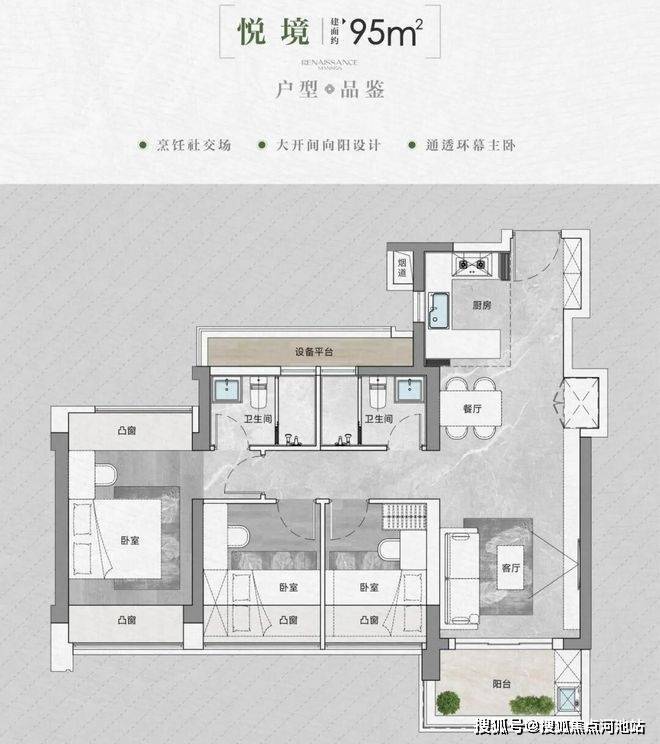 竖厅格局,进门入户玄关,超大宽面客厅5米开间,LDKB一体化,S墙设计预留冰箱卡槽位,三开间朝南,3个卧室分别做到了主卧16.62㎡/次卧11.31㎡/次卧7.28㎡(实测面积),U型厨房,卫生间干湿分离,还带2个设备平台,得房率约96.1-96.69%(包含赠送),东南或东北朝向。