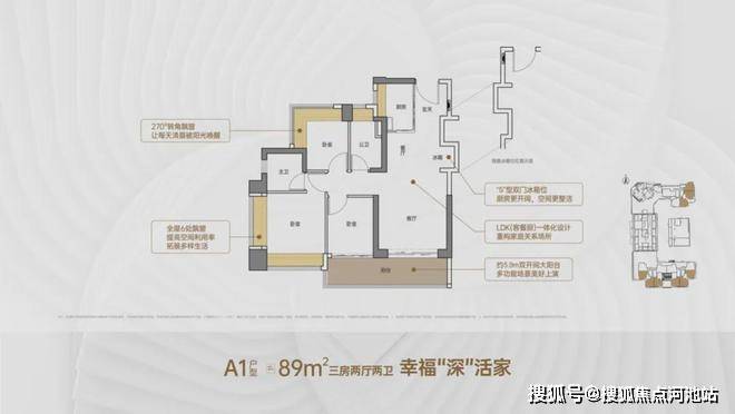 89㎡的3房2厅2卫,A1户型,设计的是竖厅格局,客厅3.5米开间,LDKB一体化,S墙设计预留冰箱卡槽位,客厅连接次卧出5.9米长的大阳台,主卧双面飘窗,次卧270度转角飘窗,U型厨房,卫生间干湿分离,阳台有朝西向、东向、南向。