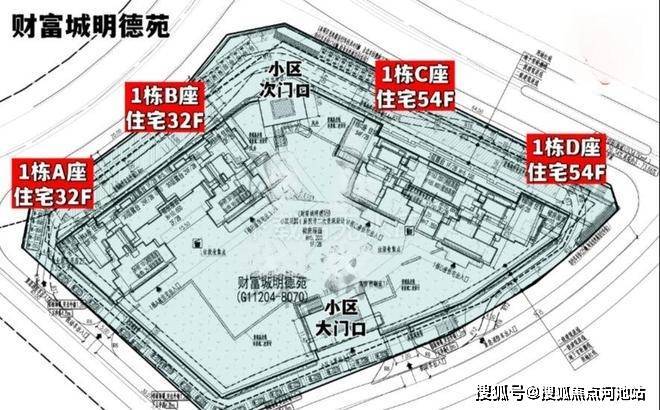 财富城明德苑,总占地面积约1.18万㎡,总建筑面积约9.89万㎡,计容建筑面积约7.64万㎡,容积率6.45,绿化率35%,共规划2栋4座32-54层高的住宅,其中1栋A/B座住宅32F,1栋C/D座住宅54F,规划有4950㎡商业。