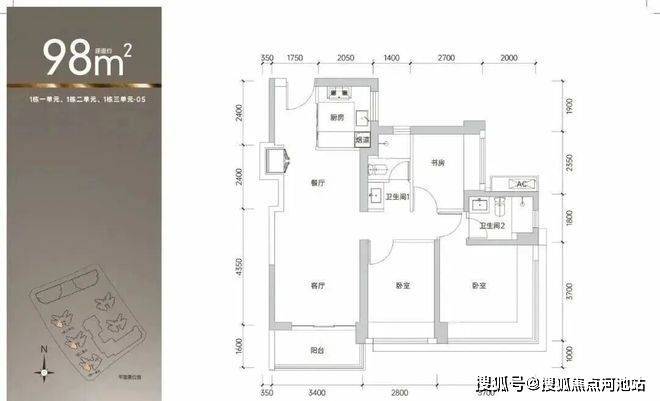 98㎡的3房2厅2卫,1栋1/2/3单元03.05户型/3栋的98平户型,设计的是经典竖厅格局,进门入户玄关,客厅3.4米开间,LDKB一体化,S墙设计预留冰箱卡槽位,三开间朝南,动静分区,3个卧室分别做到了主卧14.3㎡/次卧10.36㎡/次卧6.75㎡(包含墙体飘窗),U型厨房,公卫三段式分离,得房率约74.6-75.4%(不含赠送),东南或西南朝向。套内面积74.09㎡+赠送面积11.13㎡=实得85.22㎡,加上赠送后得房率约86.96%。