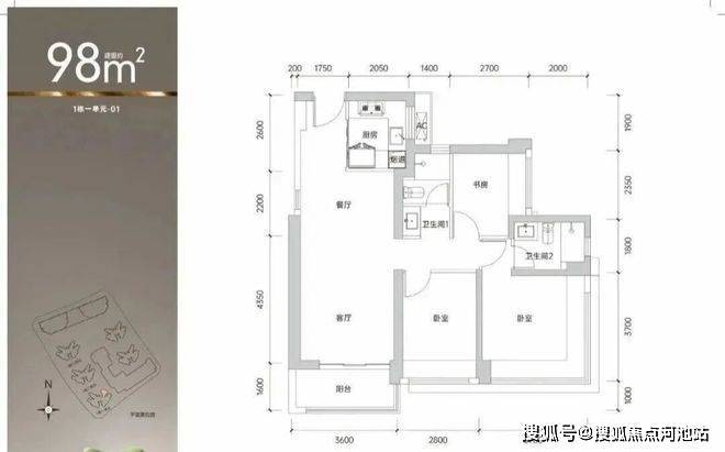 98㎡的3房2厅2卫,1栋1单元01户型,设计的是经典竖厅格局,进门入户玄关,客厅3.6米开间,LDKB一体化设计,动静分区,3个卧室分别做到了主卧14.3㎡/次卧10.36㎡/次卧6.75㎡(包含墙体飘窗),U型厨房,公卫三段式分离,得房率约75.4%(不含赠送),东北朝向。套内面积73.89㎡+赠送面积10.05㎡=实得83.94㎡,加上赠送后得房率约85.65%。