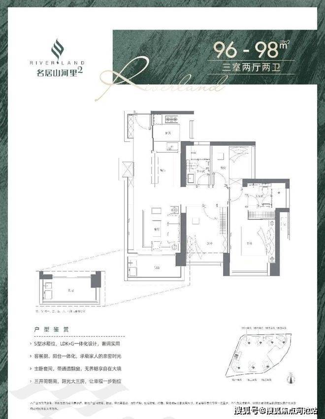 98㎡3房2卫,折后372-381万,单价3.79-3.88万/㎡;
