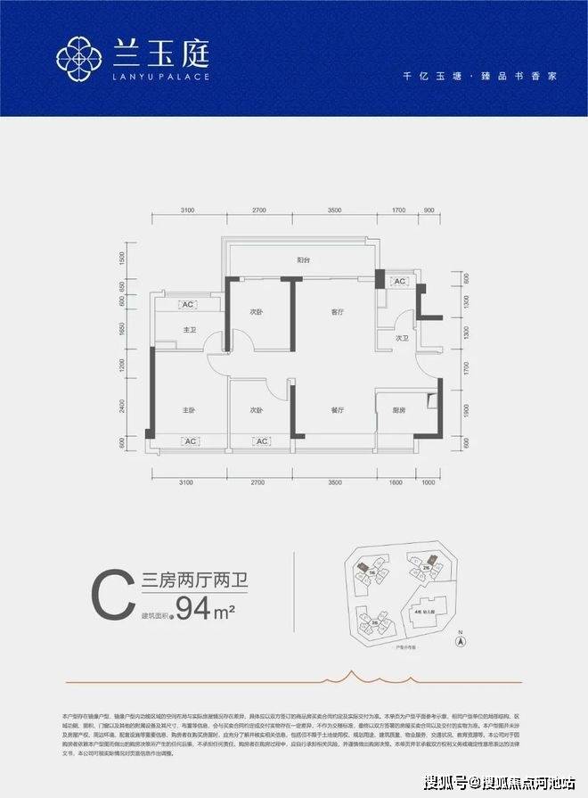 94㎡的3房2厅2卫,C户型,设计的是竖厅南北通透格局,客厅开间3.5米,3个卧室分别做到了3.1米/2.7米/2.7米的宽度,客厅连接次卧出6.2米长的大阳台,U型厨房,公卫三段式分离,得房率约79%(不含赠送),阳台主朝西北或东北向。