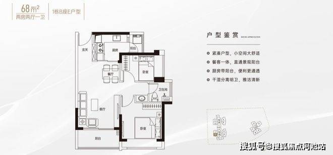 68㎡的2房2厅1卫,设计的是竖厅格局,客厅实测3.2米开间,LDKB一体化设计,动静分区,分别做到了主卧11.3㎡/次卧6.27㎡(实测面积,去掉墙体),L型厨房带1个生活阳台约1.46平,卫生间三段式干湿分离,得房率约74.9%(不含赠送),客厅阳台约4.5平,西南朝向。