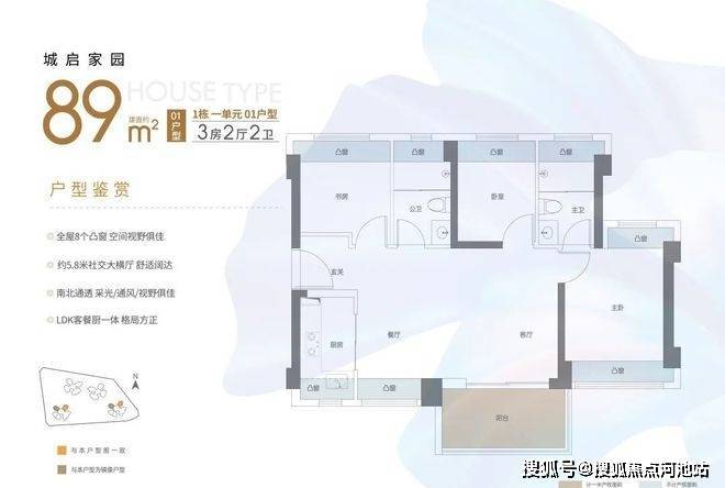 89㎡的3房2厅2卫,02.03户型,设计的是经典竖厅格局,客厅3.4米开间,LDKB一体化,S墙设计预留冰箱卡槽位,动静分区,三开间朝南,3个卧室分别做到了主卧13.79㎡/次卧7.62㎡/次卧6.93㎡(包含墙体飘窗),主卧+1个次卧270°飘窗设计,U型厨房,公卫三段式分离,客厅连接卧室出5.75米长的大阳台,得房率约87.2%(包含赠送),东南朝向。